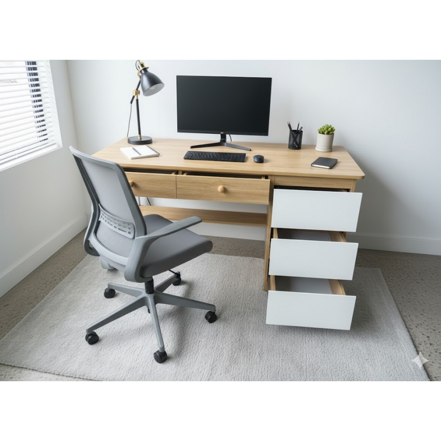 Mặt bàn dài 1400mm giúp người dùng dễ dàng bố trí nhiều thiết bị như laptop, màn hình lớn, tài liệu, sách vở mà vẫn giữ được sự thoải mái khi làm việc hoặc học tập. Toàn bộ phần gỗ sử dụng MDF dày 17mm, bề mặt phủ melamine nhẵn mịn, dễ vệ sinh, không bám bẩn, phù hợp sử dụng lâu dài.