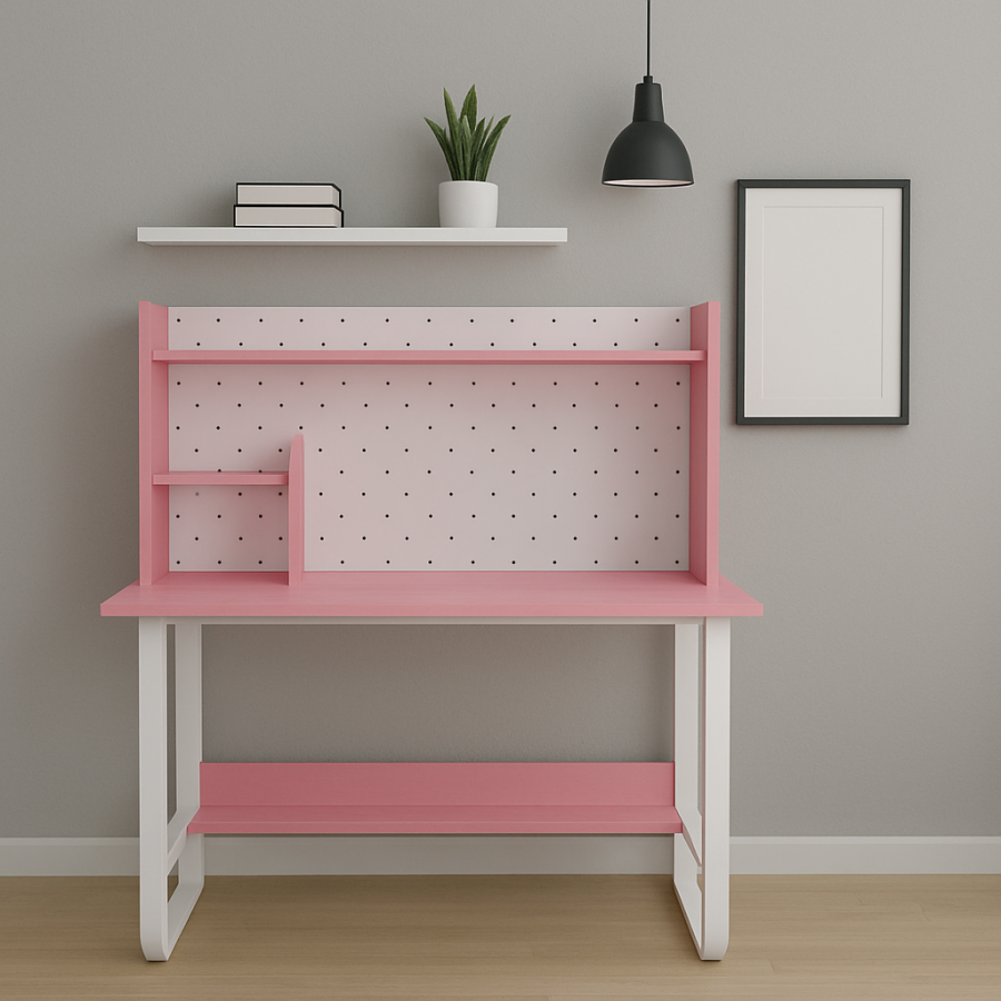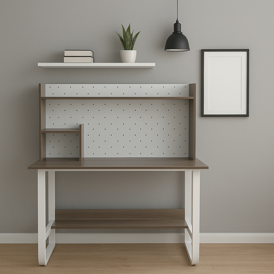 Với chiều dài 1200mm, mặt bàn đủ rộng để bố trí đồng thời laptop, màn hình máy tính, tài liệu, sách vở và các phụ kiện cần thiết. Kệ phía sau kết hợp bảng lỗ treo đồ giúp sắp xếp vật dụng khoa học, tạo thói quen làm việc ngăn nắp và hiệu quả.