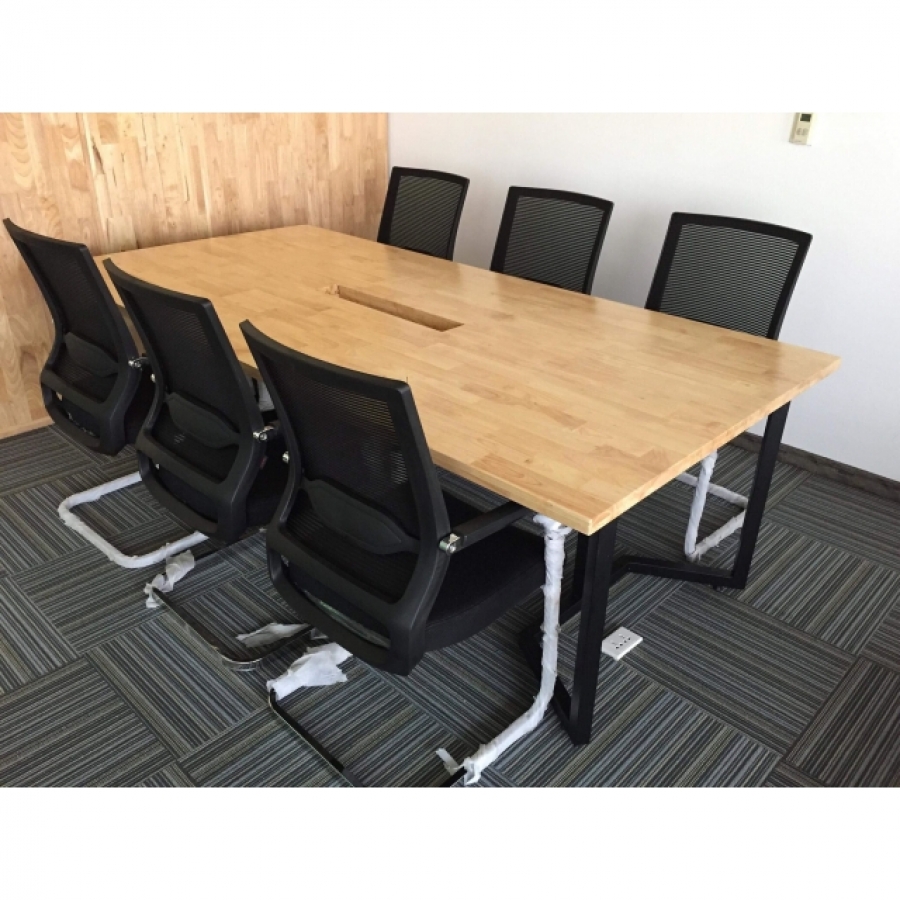 Bàn họp chân sắt BH68001 có kích thước 2m4 x 1m2 phù hợp với số lượng người từ 6 - 12 người. Mặt bàn được làm bằng chất liệu gỗ cao su chuẩn xuất khẩu, đã qua xử lý công nghệ chống cong vênh và chống thấm nước, được sơn phủ PU chống trầy rất tốt. Chân bàn được làm bằng sắt hộp, sơn tĩnh điện chống gỉ rất chắc chắn, với thiết kế khung hình chữ U luôn đảm bảo độ chắc chắn cho bàn và giúp tận dụng không gian rất tốt.