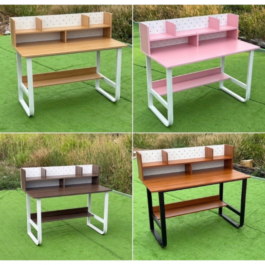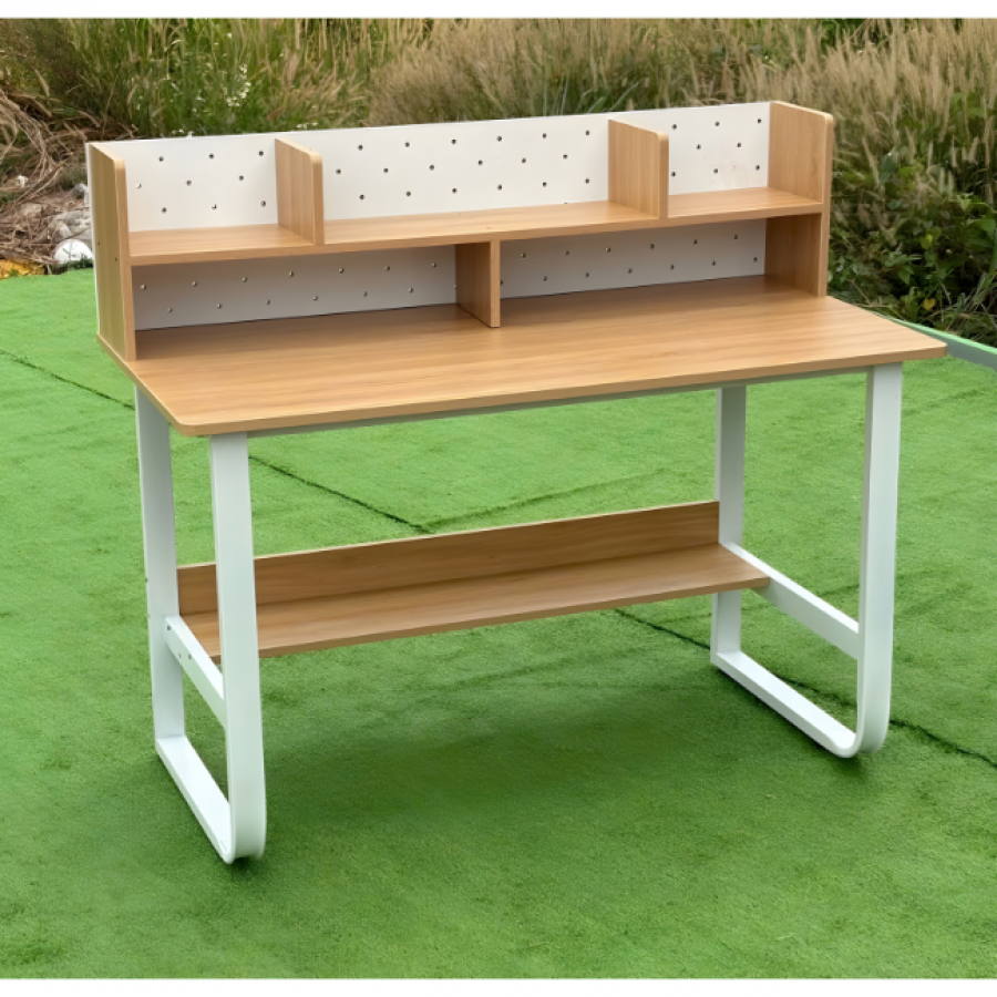 Hệ kệ sau được thiết kế liền bàn với vách trang trí dạng lỗ, vừa tạo điểm nhấn thẩm mỹ vừa hỗ trợ treo phụ kiện, đèn học hoặc bảng ghi chú. Kệ phụ bên hông giúp sắp xếp sách, tài liệu và đồ dùng cá nhân gọn gàng, giữ cho không gian làm việc luôn ngăn nắp.