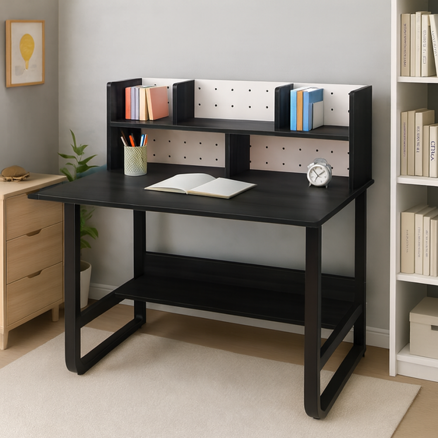 Hệ kệ sau thiết kế thông minh với vách lỗ trang trí vừa tạo điểm nhấn thẩm mỹ vừa hỗ trợ treo phụ kiện, đèn, bảng ghi chú. Kệ nhỏ bên hông tiện lợi để sách, tài liệu hoặc đồ dùng cá nhân, giúp bàn luôn gọn gàng và khoa học.